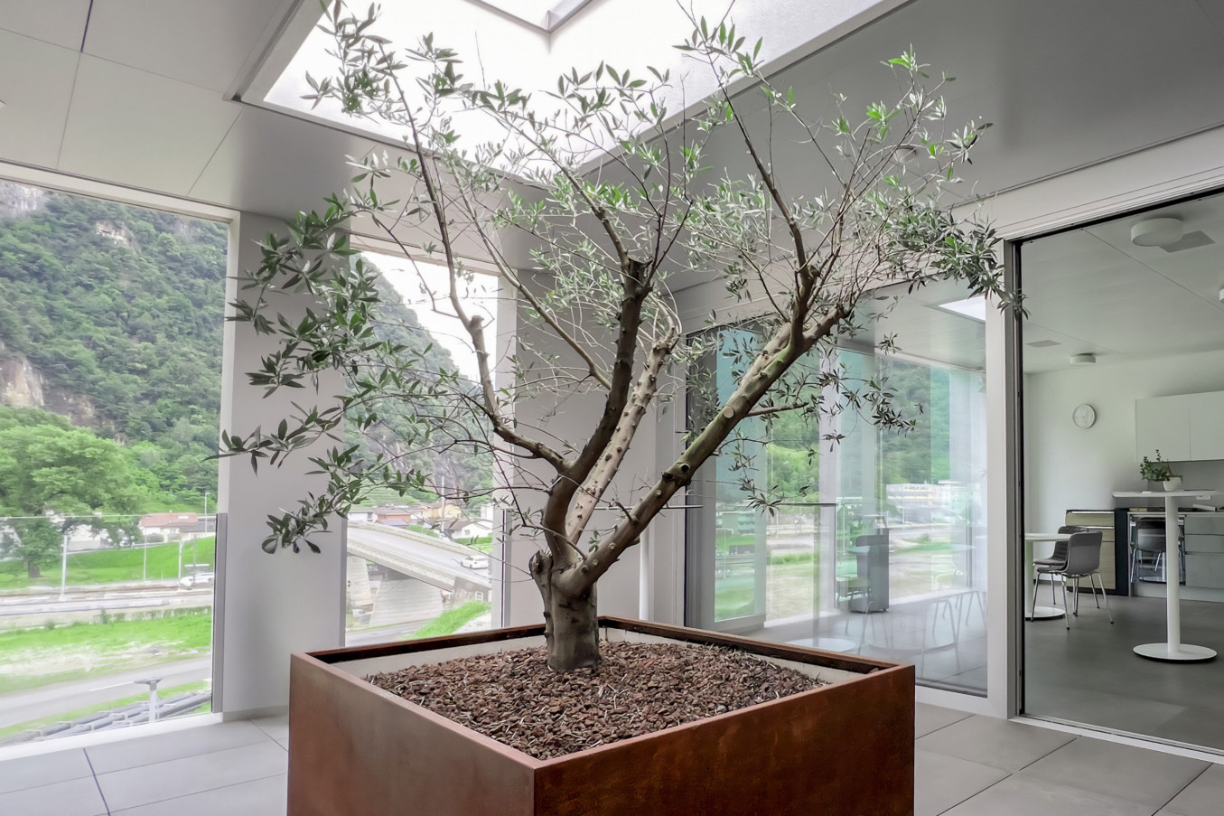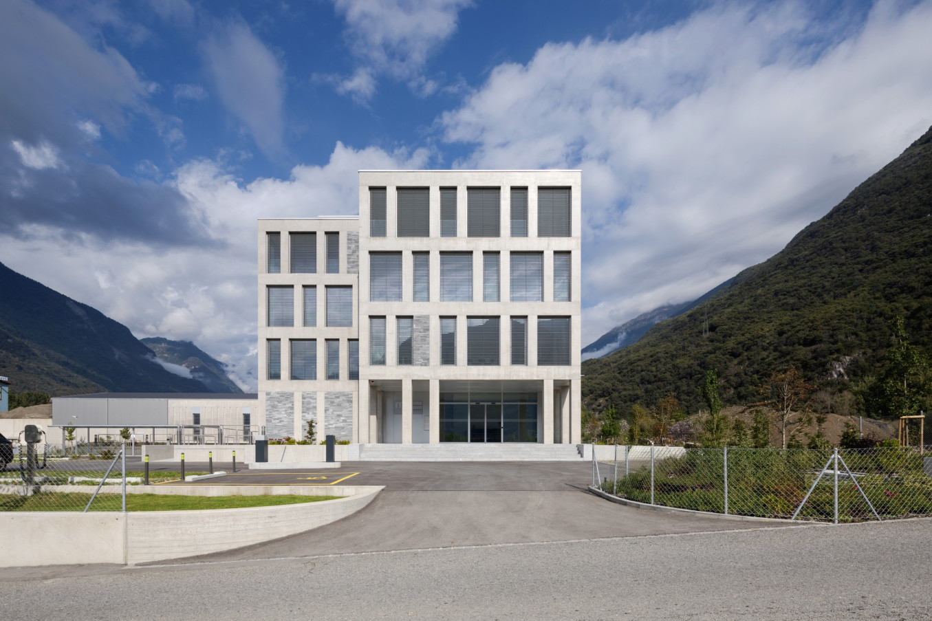 The building appears as a compact, clearly articulated volume framed by a continuous reinforced concrete plinth. This distinctive element reliably protects the entire structure against flooding while shaping its external character. Behind the calm, bright exposed concrete façades, four above ground floors and a basement offer workspace for around 145 skilled tradespeople and administrative employees. Inside, white dominates: the ground floor surface extends over 1800 square metres, and the two internal staircases are clad in white fibre cement. A symbolic olive tree on the third floor completes the ensemble and subtly ties the architecture to its natural surroundings.