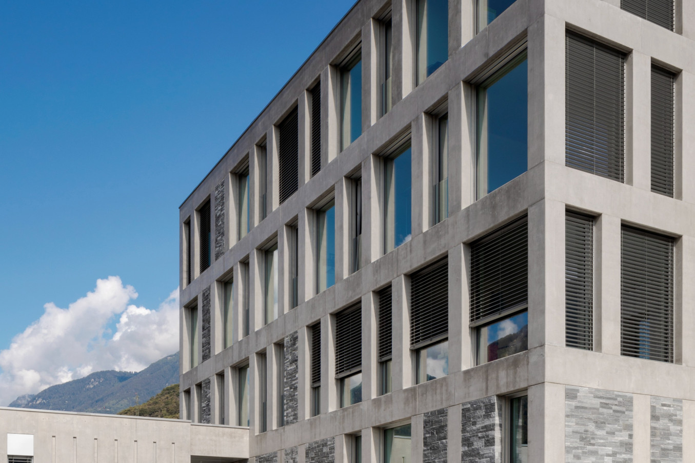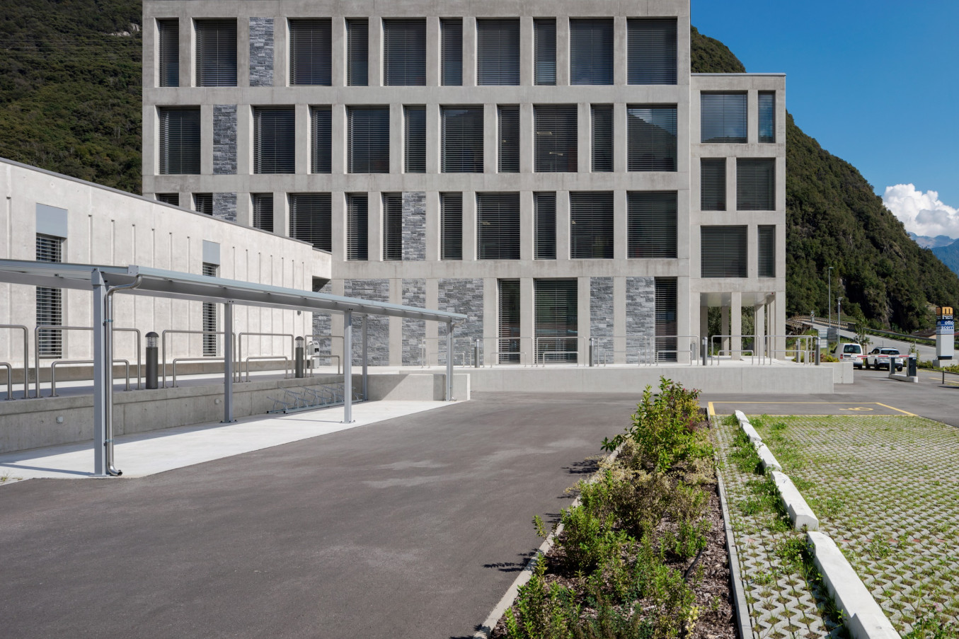 - Bright exposed concrete façades in dialogue with the natural environment