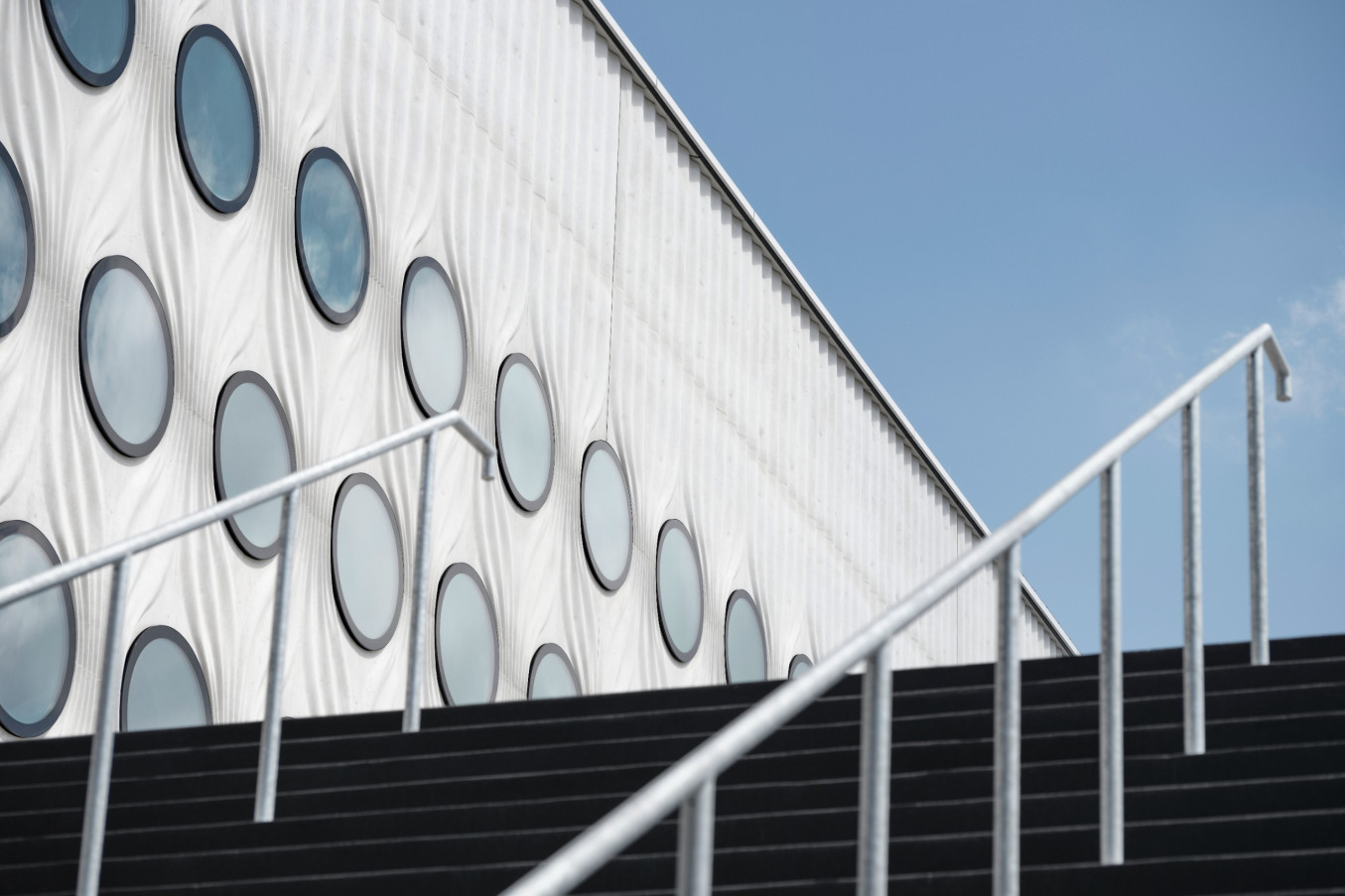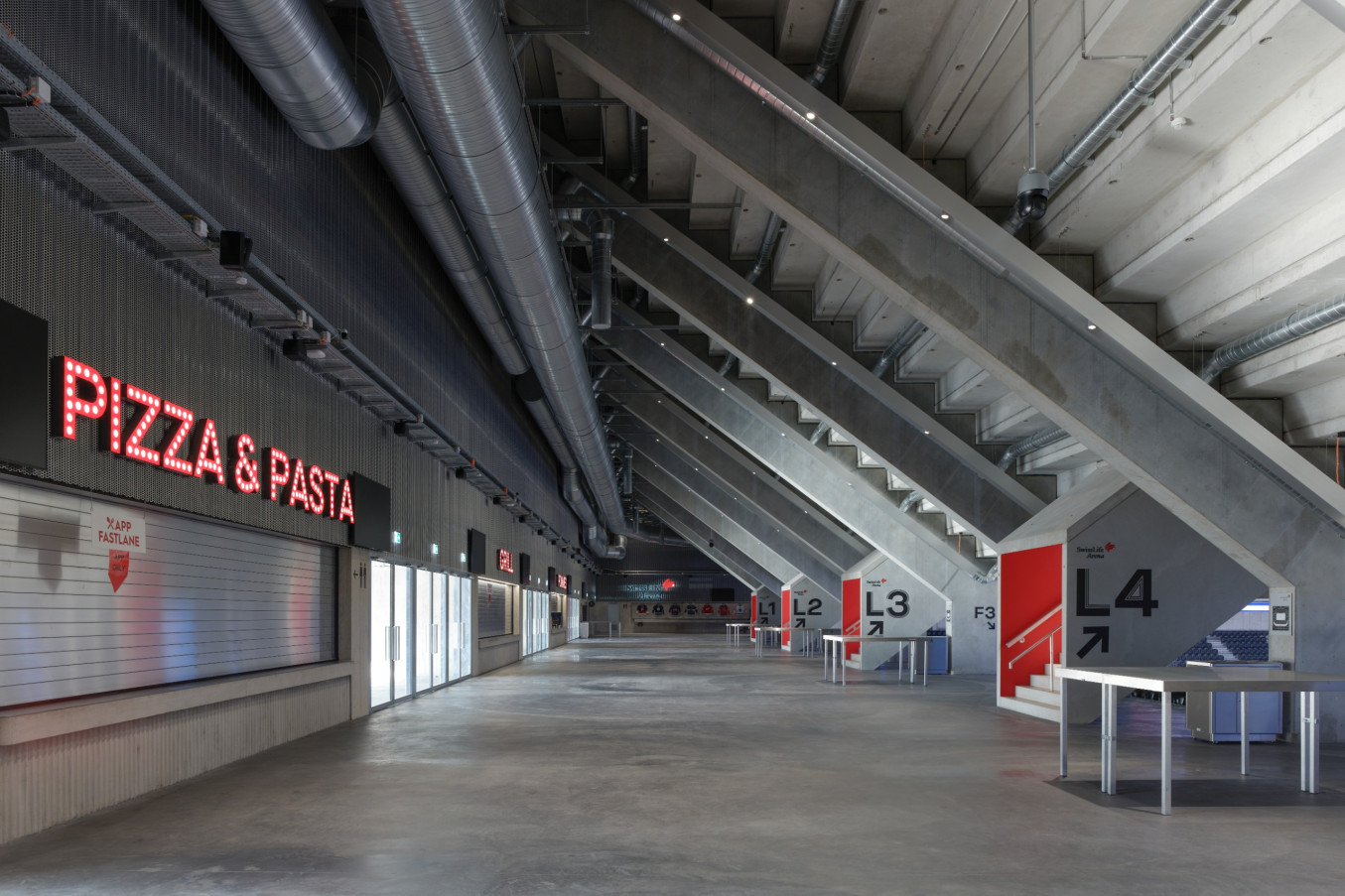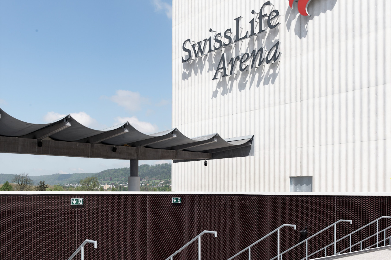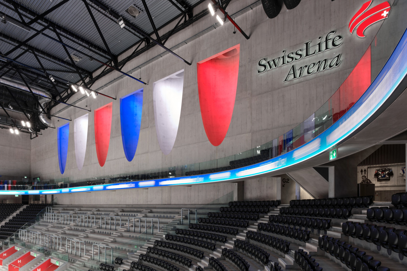 The «Theatre of Dreams» is wrapped in an apparently weightless curtain of exposed concrete in white cement. Around the porthole-shaped windows set at regular intervals into the exterior wall, the folds ripple and billow, creating the illusion of moving fabric concealing the arena with its volume of 478,000 cubic metres. The extraordinary textile appearance of this facade was developed over five years using 40 different, unique formwork moulds. Around 110,000 tonnes of concrete were poured on site, «like a dam» in the words of architect Adam Caruso. Continuous pours of six metres in height ensured the seamless folded structure. Located between Zurich Altstetten train station and the A1 motorway, the Swiss Life Arena covers some 28,000 square metres and seats 12,000 spectators.